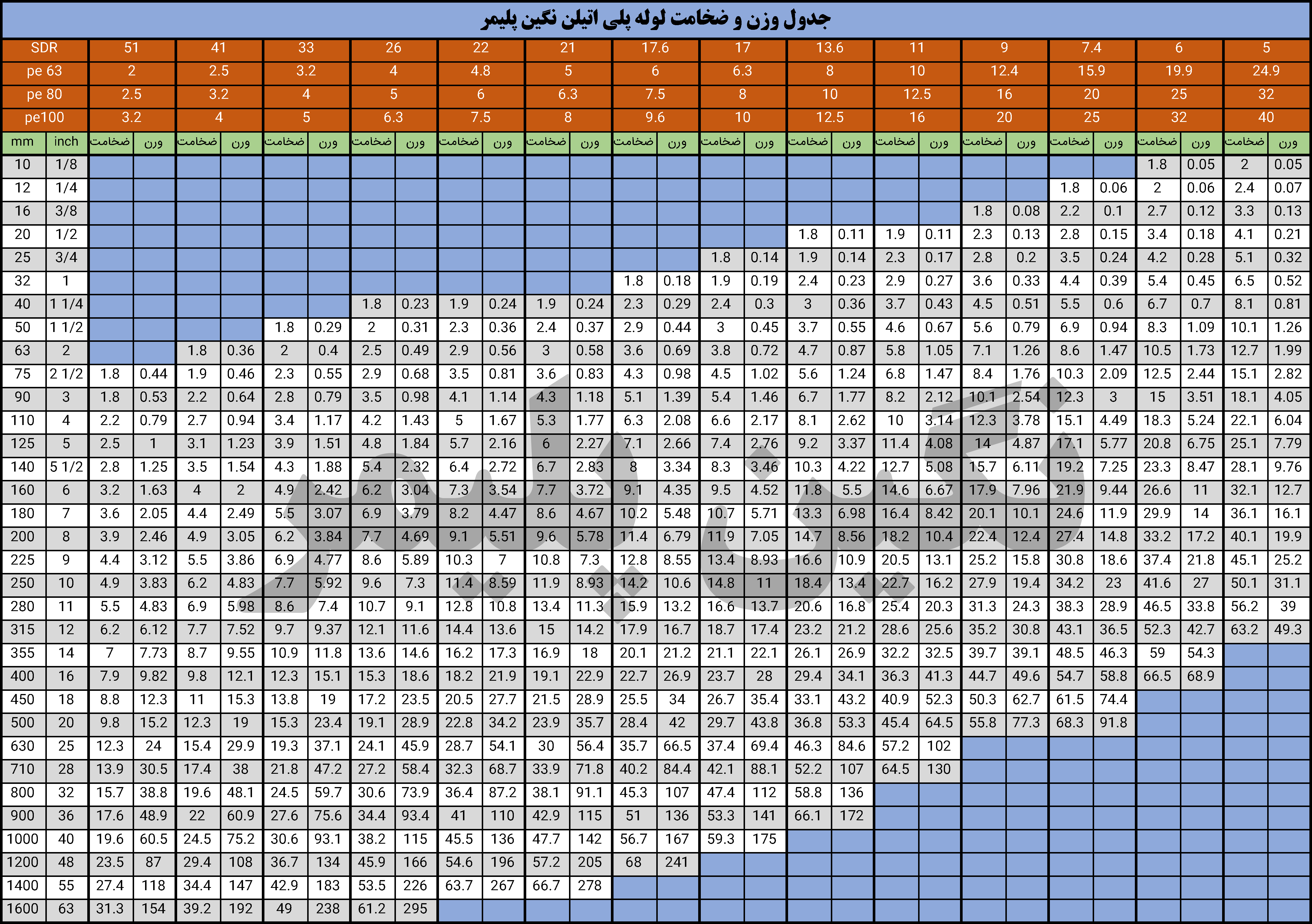 جدول ضخامت و وزن لوله پلی اتیلن pe100