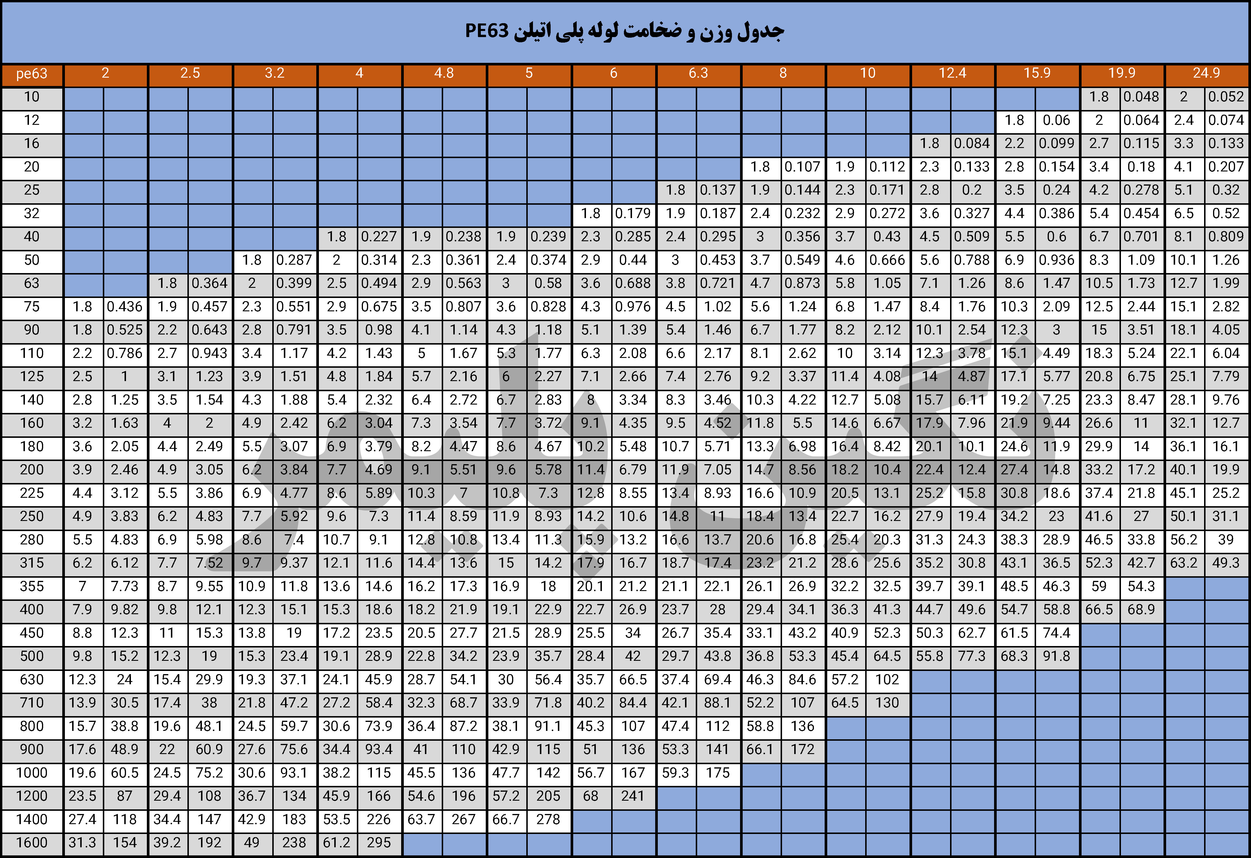 جدول ضخامت و وزن لوله پلی اتیلن pe63
