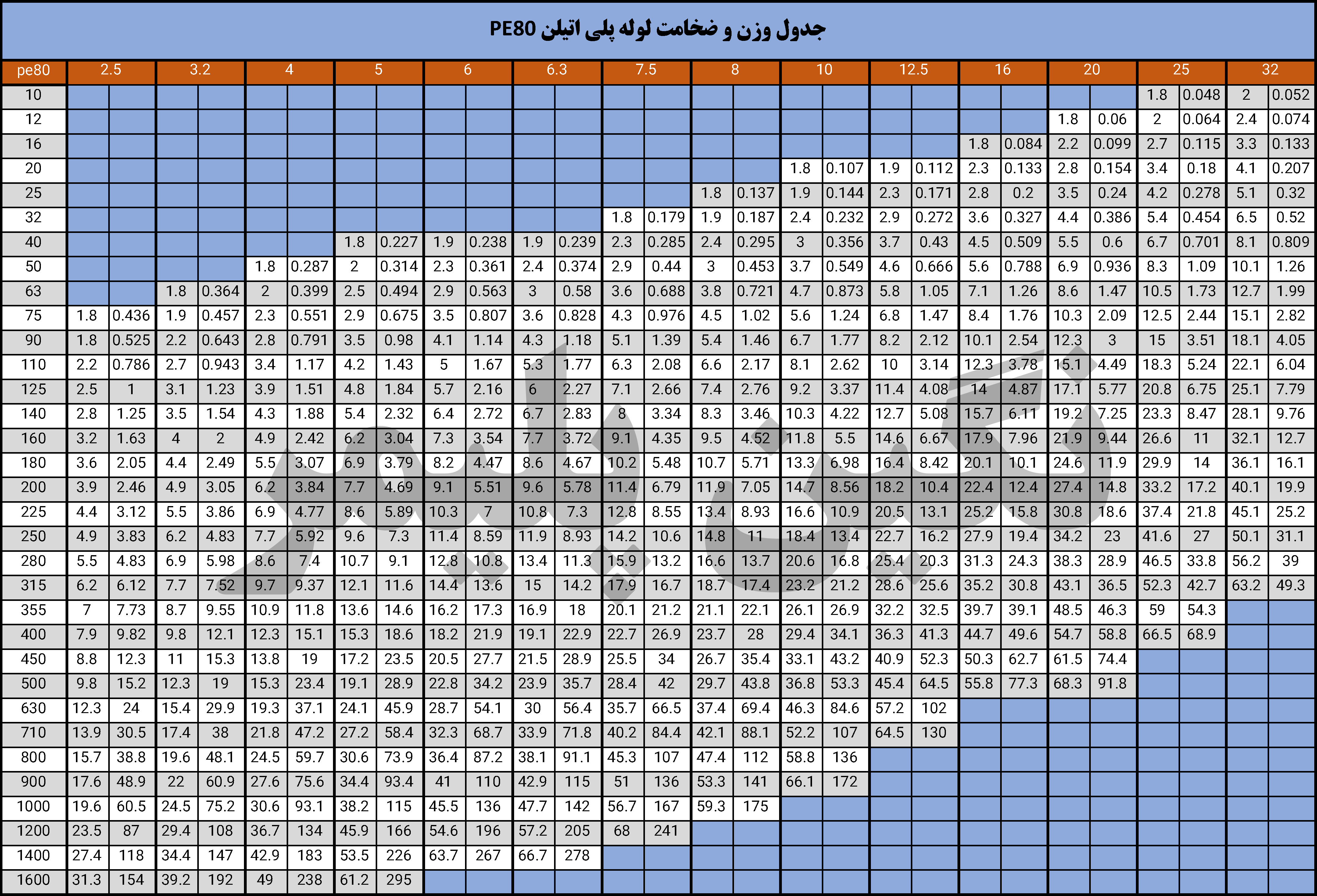 جدول ضخامت و وزن لوله پلی اتیلن pe80